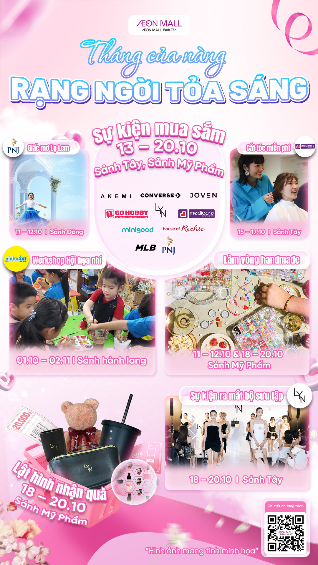 Chào đón tháng 10 rực rỡ, AEON MALL Bình Tân mang đến chuỗi sự kiện đặc biệt mang tên "Tháng Của Nàng - Rạng Ngời Tỏa Sáng" với vô vàn hoạt động mua sắm, làm đẹp và trải nghiệm workshop độc đáo. Hãy cùng khám phá những điểm nhấn không thể bỏ qua trong chương trình này nhé!