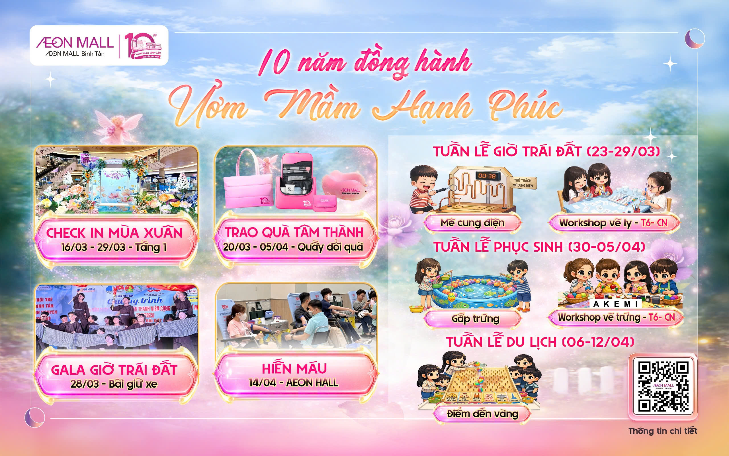 Từ ngày 16/03 đến 14/04/2026, không gian tại AEON MALL Bình Tân sẽ được thay áo mới với những cụm trang trí hoa xuân rực rỡ và hàng loạt hoạt động tương tác thú vị: