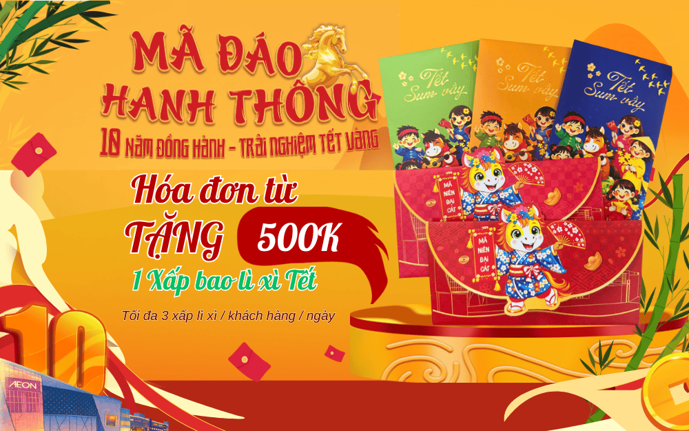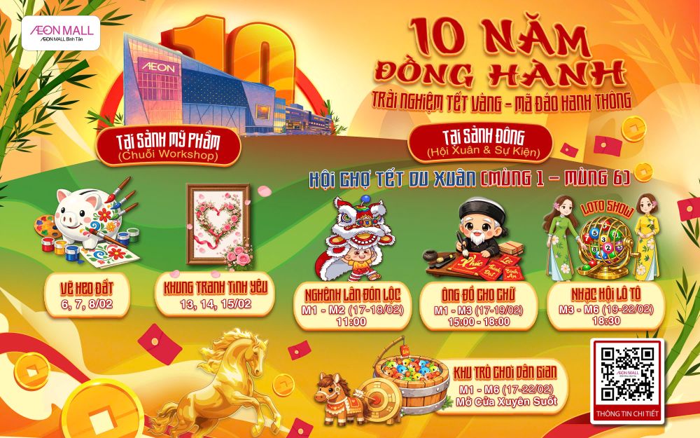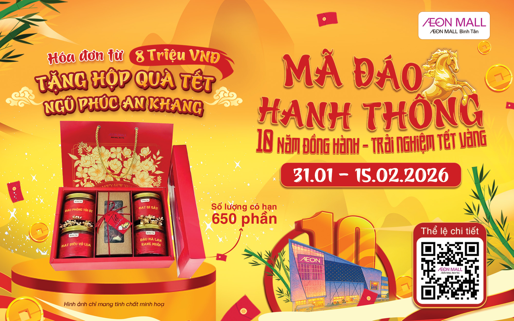 Tết Nguyên Đán 2026 không chỉ là khởi đầu của một năm mới mà còn là dấu mốc vàng son – Kỷ niệm 10 năm AEON MALL Bình Tân đồng hành cùng gia đình Việt. Với chủ đề "Mã Đáo Hanh Thông – Trải Nghiệm Tết Vàng", chúng tôi mang đến một không gian "Tết Vàng" rực rỡ với những món quà tri ân giá trị và các hoạt động văn hóa dân gian đặc sắc kéo dài từ giữa tháng 1 đến hết tháng 2/2026.