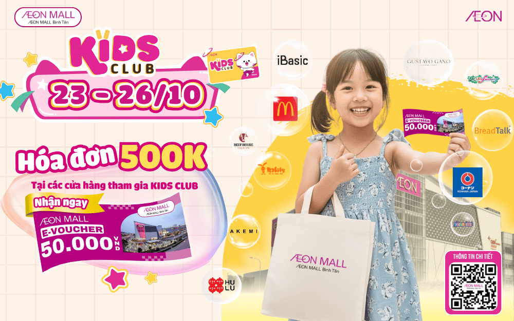 Từ ngày 23-26.10 này, AEON MALL Bình Tân mang đến chương trình ưu đãi cho các thành viên KIDS CLUB khi mua sắm tại các cửa hàng tham gia