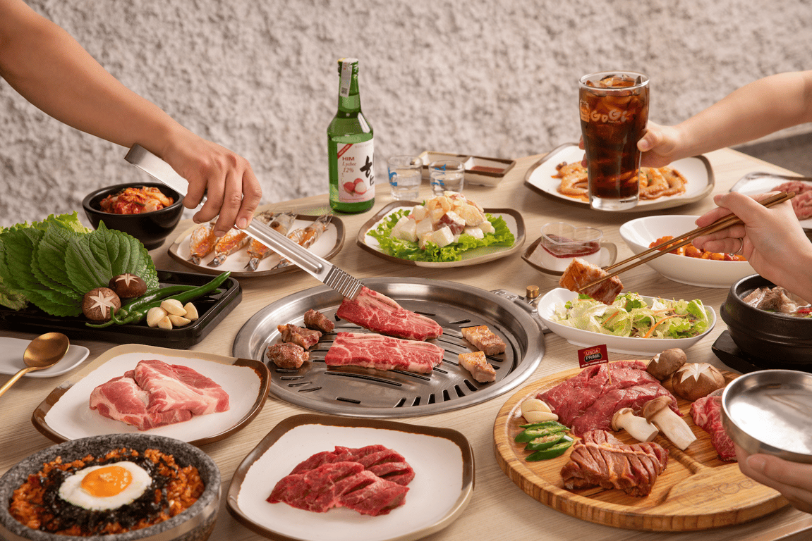 Menu Quốc Dân 2.0 199K sẽ đưa thực khách thưởng thức 7 loại thịt bò thượng hạng như gầu bò Mỹ mềm mọng và lõi vai bò xốt đậm đà, 4 loại thịt heo hấp dẫn như thịt ba chỉ heo nạc mỡ đan xen. Đặc biệt, menu buffet còn giới thiệu hai món mới: gà xào bắp cải phô mai và Jeyuk bokkeum. Ngoài ra, 3 loại salad Hàn Quốc thanh mát và dưa hấu tráng miệng sẽ giúp bữa nướng của bạn trở nên trọn vẹn và không bị ngán.