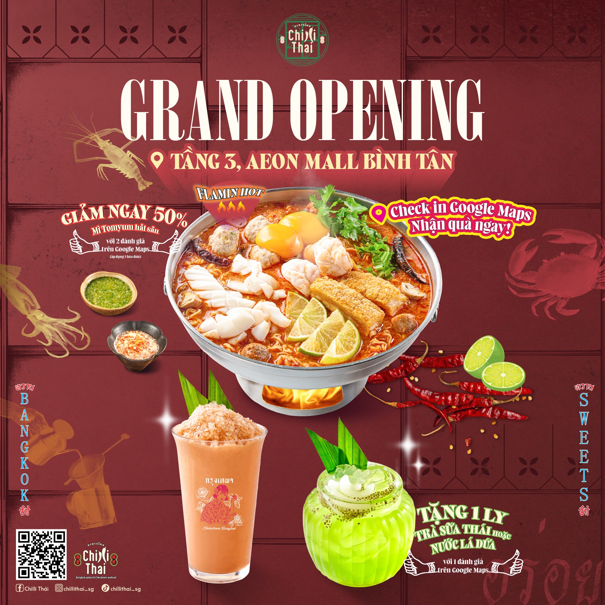Tin vui dành cho các tín đồ của ẩm thực Thái Lan tại khu vực Bình Tân! Hai thương hiệu Thái Lan nổi tiếng là CHILLI THÁI (Nhà hàng Thái) và SIAM SUGAR (Trà sữa & Tráng miệng) đã chính thức khai trương, tạo nên một tổ hợp ẩm thực Thái Lan hoàn chỉnh ngay tại AEON MALL Bình Tân.